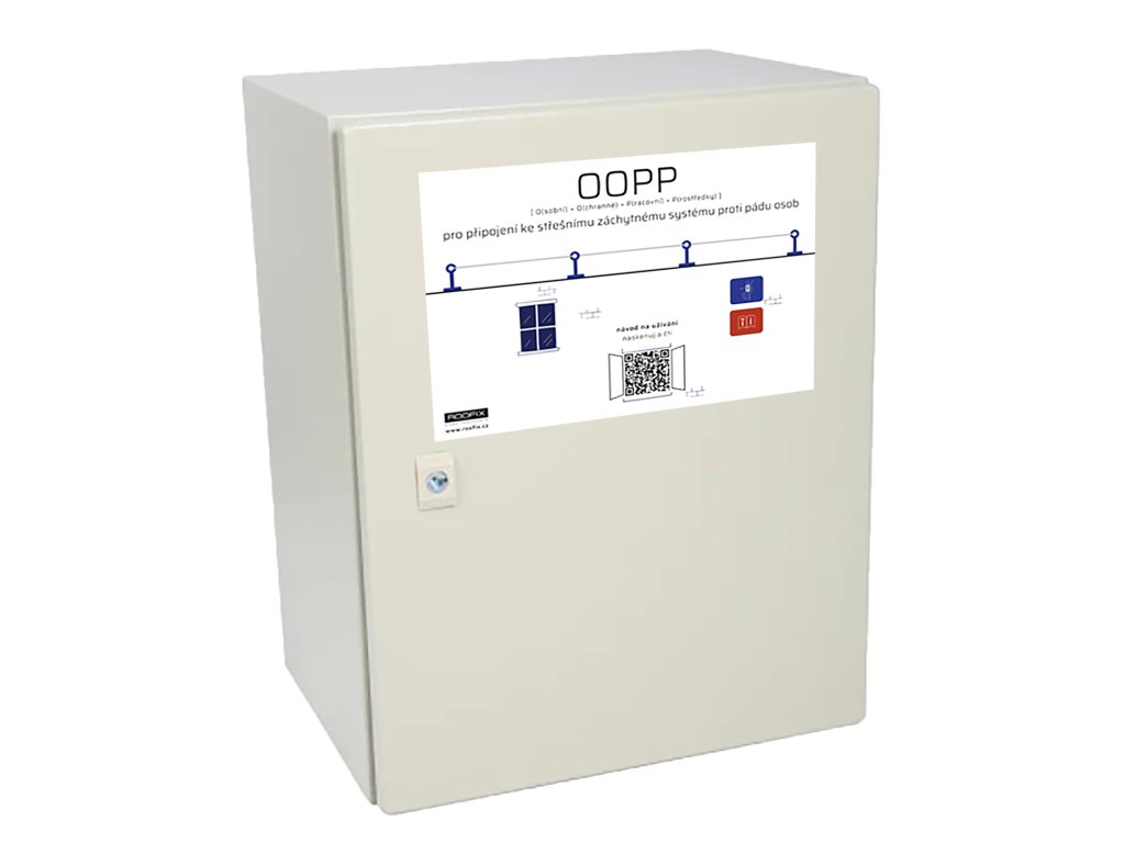 Skříňka na osobní ochranné pracovní prostředky pro práci ve výškách, která se instaluje v místě práce. Má jednoduchý zamykací systém.